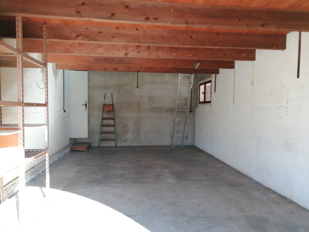 Grand garage attenant d'environ 30m² avec mezzanine donnant accès au combles sur dalle.