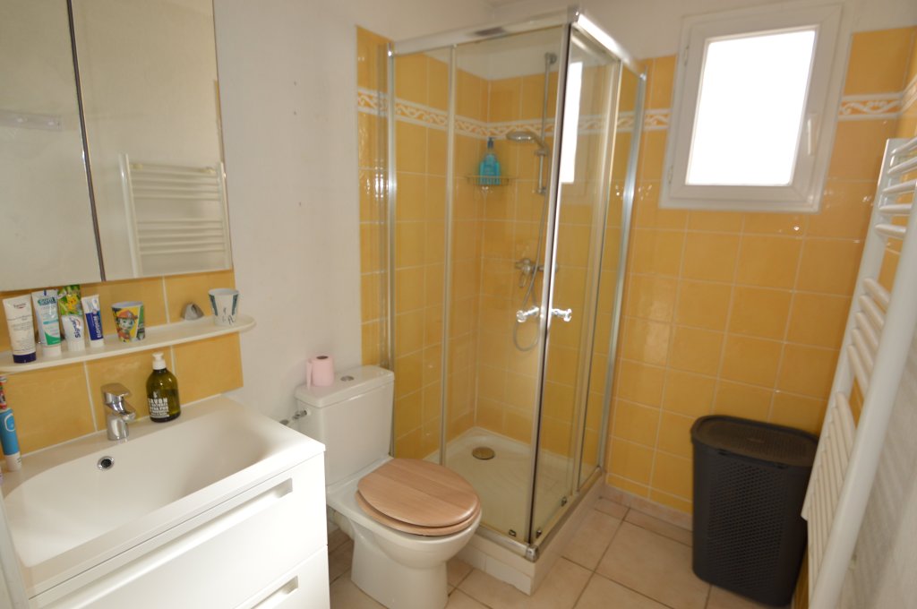 Elle est composée au rez-de-chaussée d'un beau séjour et d'une cuisine équipée ouverts sur une terrasse couverte plein sud, d'une chambre et d'une salle d'eau avec wc,