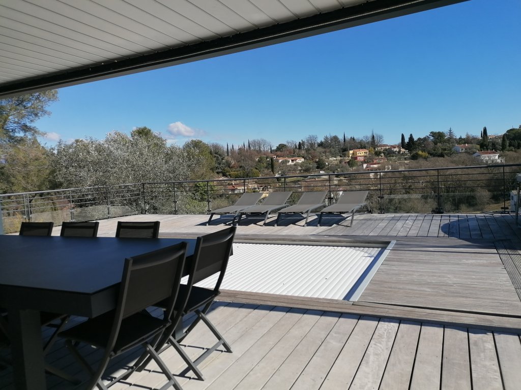 En rez-de-jardin, un vaste salon / salle à manger donnant sur une grande terrasse avec sa piscine traditionnelle, une cuisine ouverte équipée avec buanderie, un bureau et un WC.