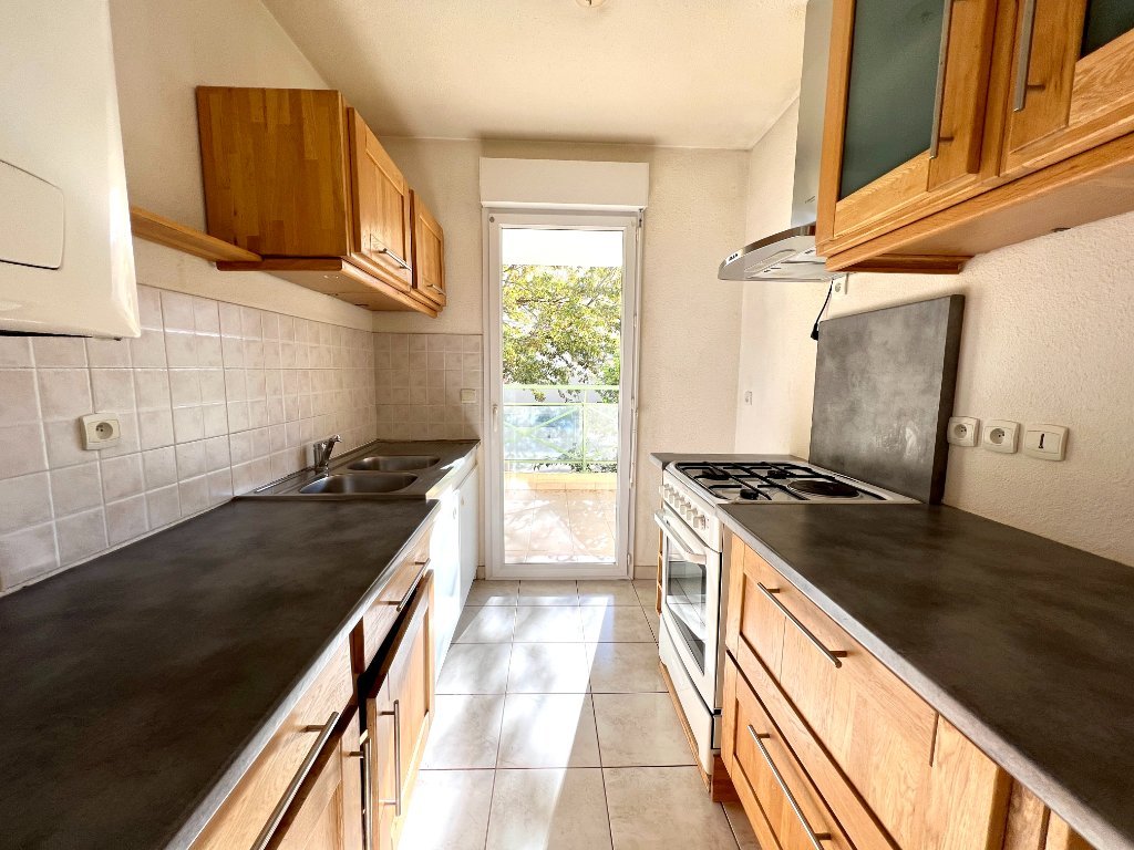 Une cuisine et un séjour donnant accès à une belle terrasse, une chambre avec placards, une salle de bain et un WC.