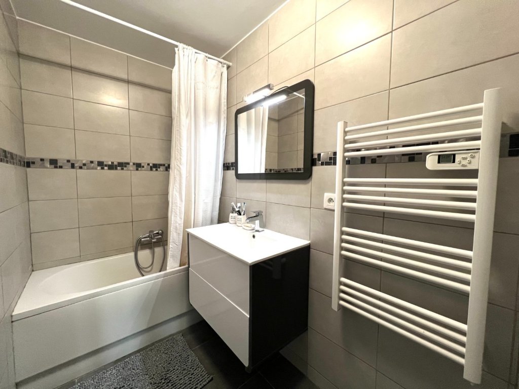 - D'une salle de bain avec sa baignoire, vasque et sèche serviette
