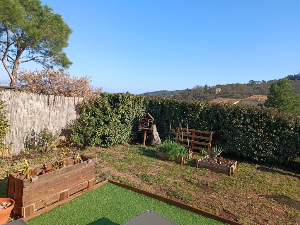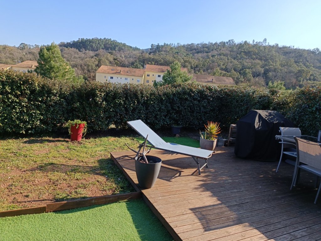 Roquebrune sur Argens, dans environnement familial, au calme, et à 10 minutes de la mer, un appartement comprenant un salon séjour (ouvert sur jardin) avec cuisine ouverte meublée équipée, 2 chambres ( accès jardin) , une salle de bain , un wc , un garage .